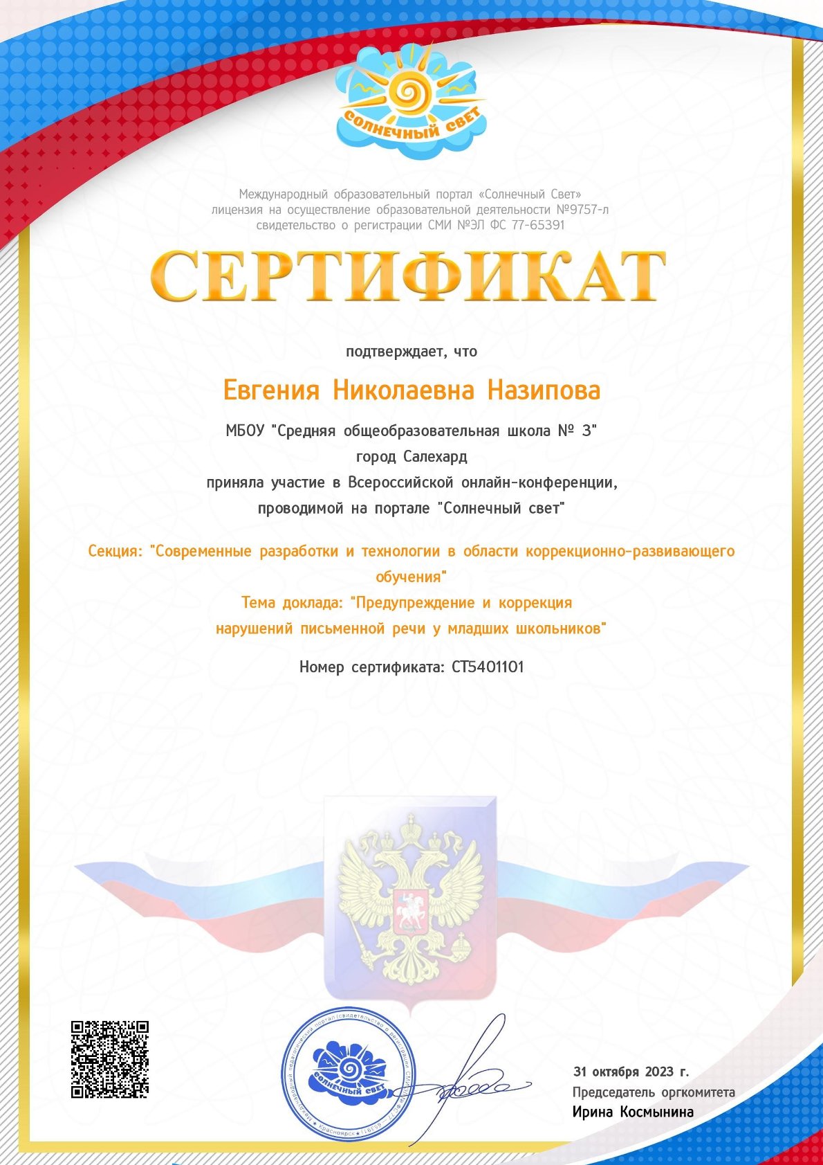 2023ВсероссийскийДистанционная. Участие в онлайн-конференции образовательного портала «Солнечный свет», «Предупреждение и коррекция нарушений письменной речи у младших школьников»Сертификат № СТ5401101 от 31.10.2023 https://cloud.mail.ru/public/vwcY/VmPxnk856