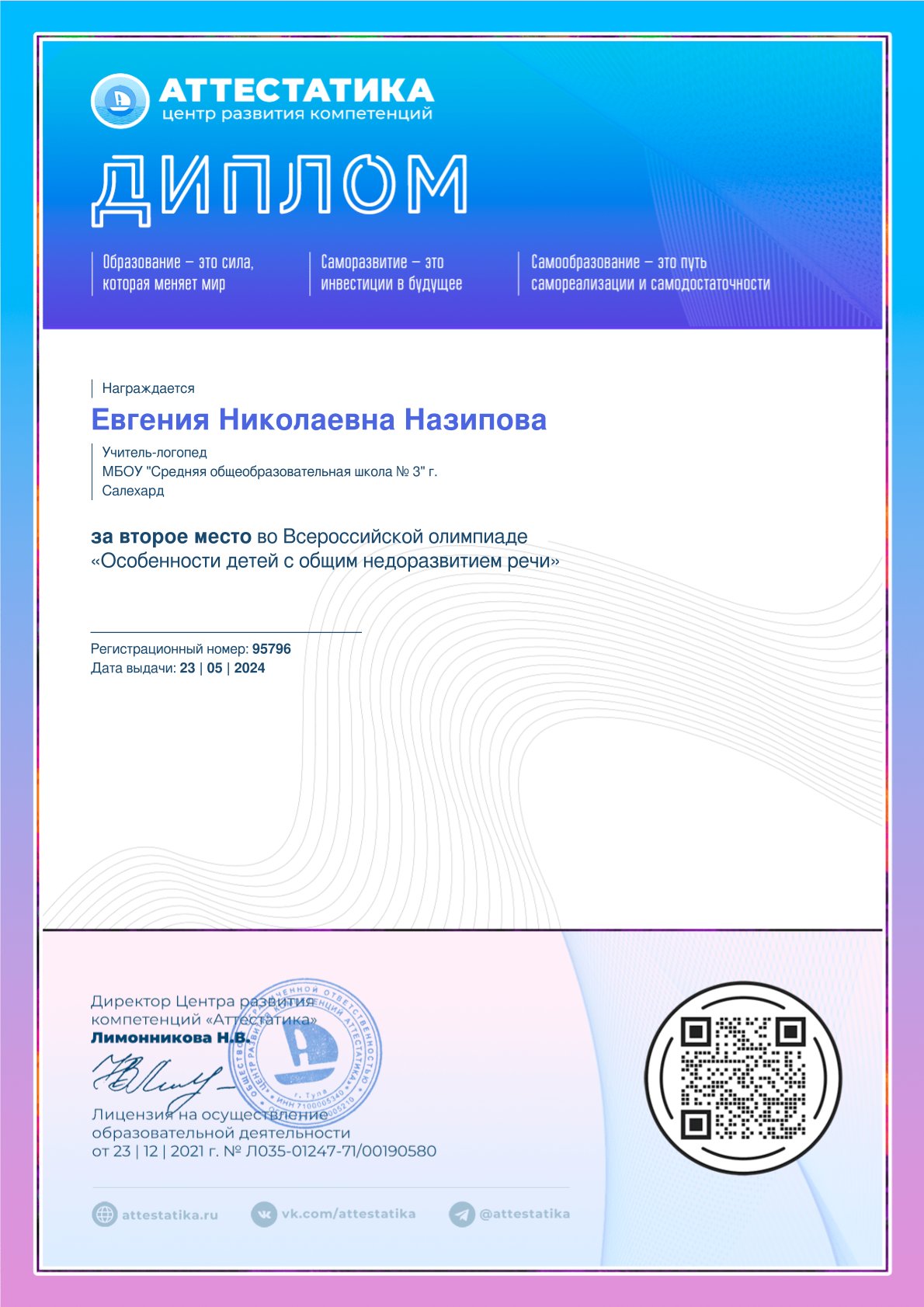 | 2024 | Всероссийский | Всероссийская олимпиада«Особенности детей с общим недоразвитием речи» | Диплом (IIместо) от 23.05.2024 https://cloud.mail.ru/public/s3Ak/m7FzjeZ3k |