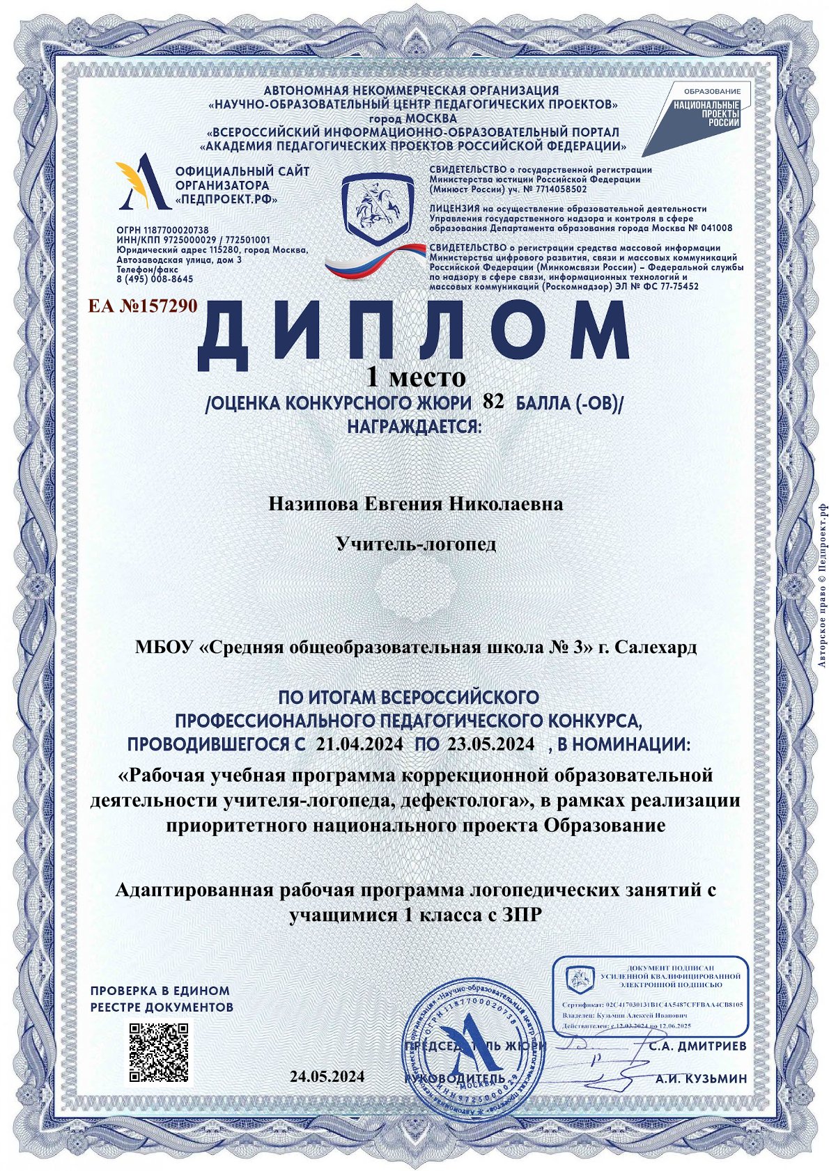 | 2024 | Всероссийский | Профессиональный педагогический конкурс, номинация «Рабочая учебная программа коррекционной образовательной деятельности учителя-логопеда, дефектолога» | Диплом (Iместо) от 24.05.2024 https://cloud.mail.ru/public/vPdw/mcQnPMG4B |