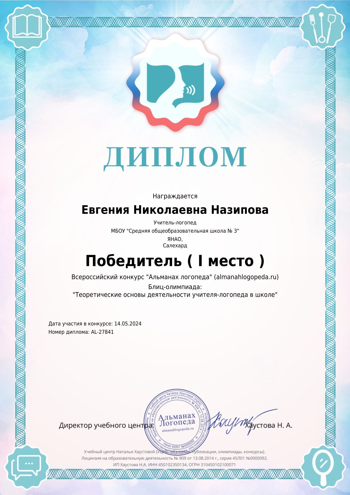 | 2024 | Всероссийский | Всероссийский конкурс «Альманах логопеда» (almanahlogopeda.ru). Блиц-олимпиада: «Теоретические основы деятельности учителя-логопеда в школе» | Диплом победителя (I место) от 14.05.2024 https://cloud.mail.ru/public/iBMN/SEet7F4Mw |