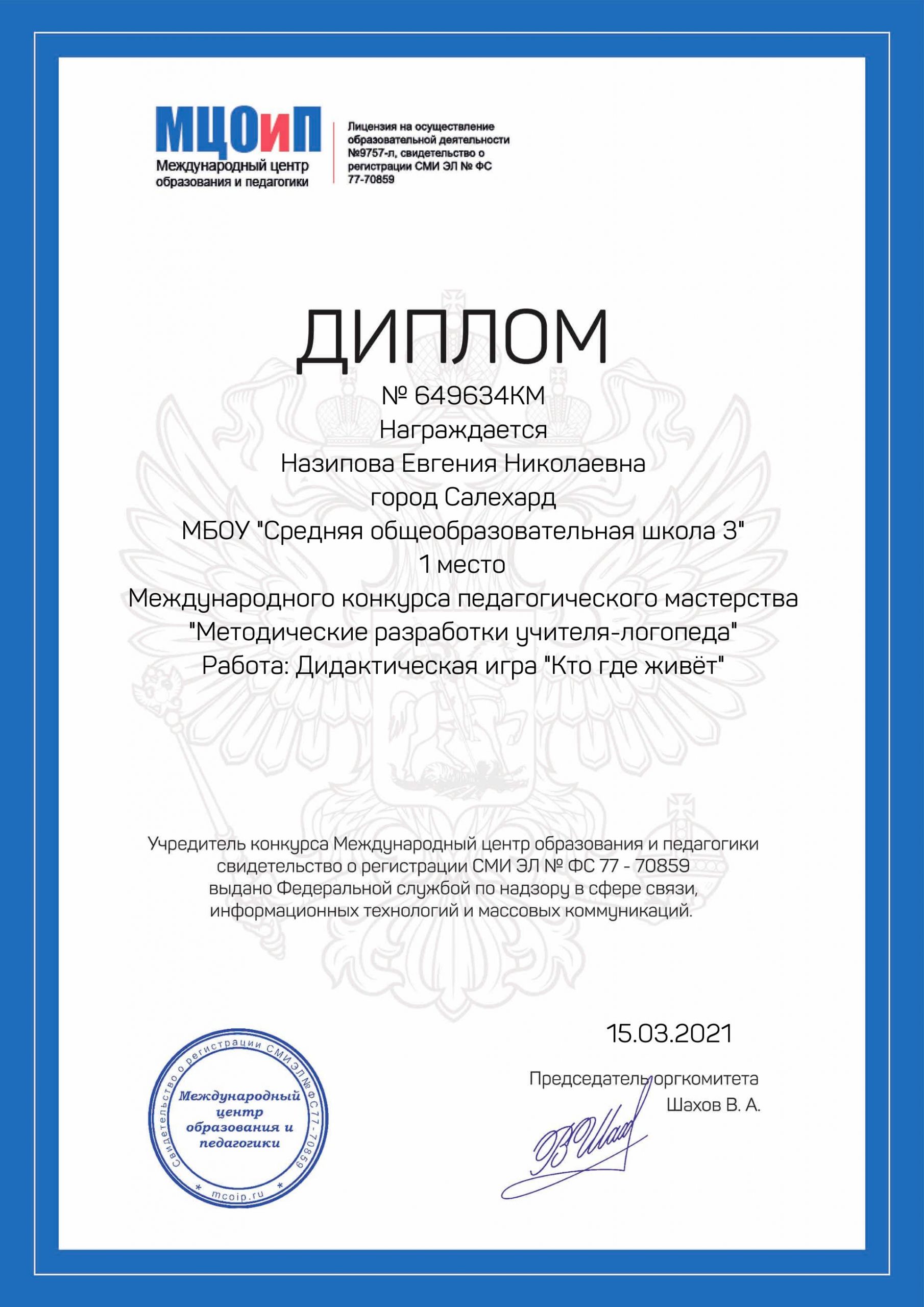 | 2021 | Международный | Международный конкурс педагогического мастерства «Методические разработки учителя-логопеда» | Диплом победителя (I место) от 15.03.2021 https://cloud.mail.ru/public/cjQk/KtuUjfUkL |